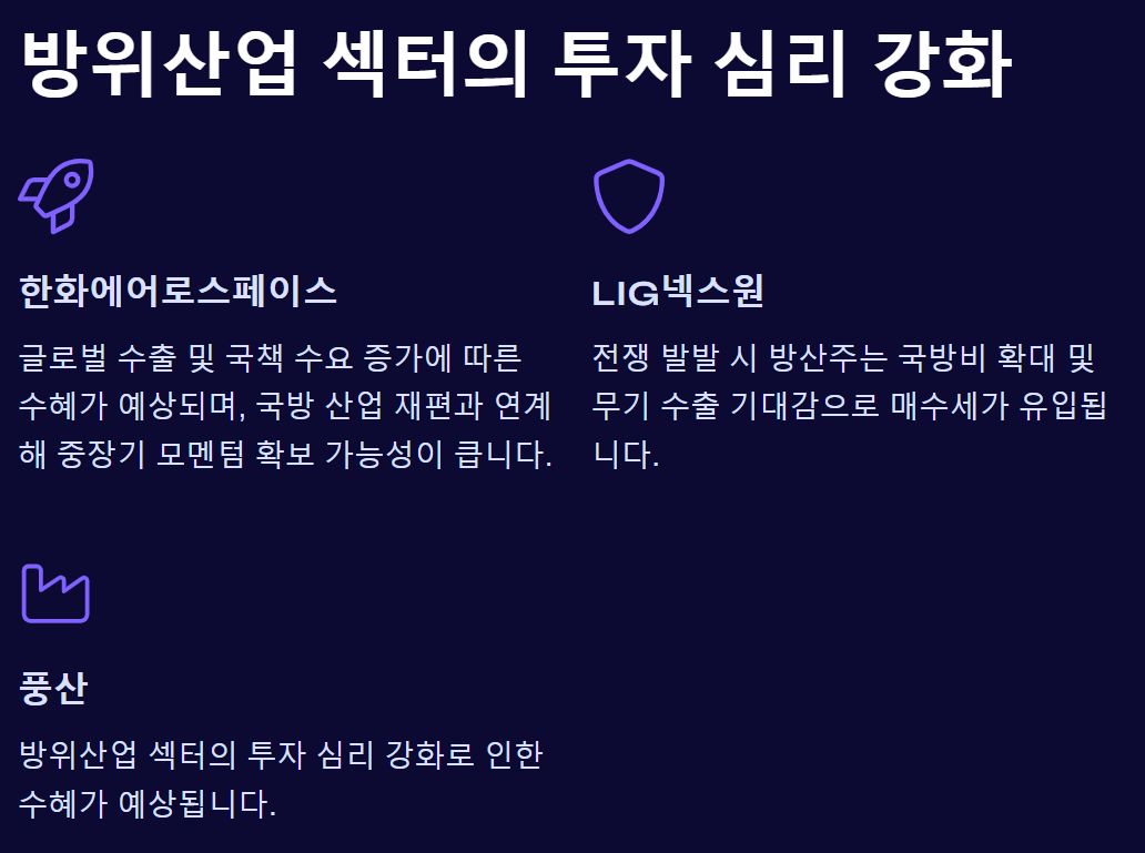 국방비 지출과 무기 수출이 동시에 증가할 가능성이 크기 때문에 방산주에 대한 수요가 급증합니다.