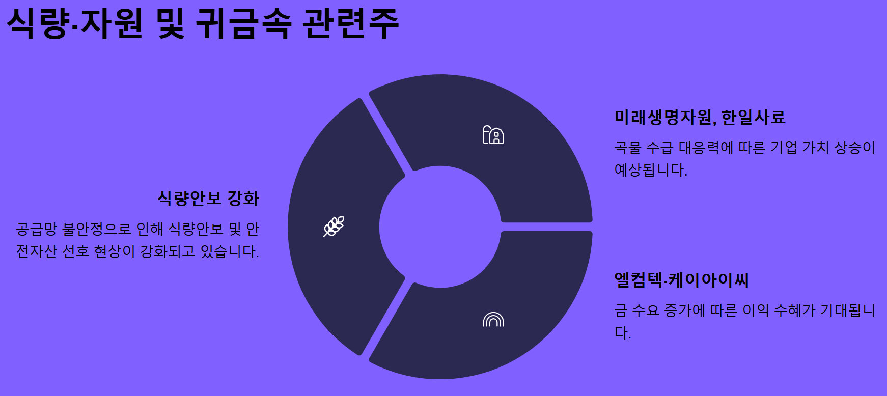 - 미래생명자원, 고려산업, 한일사료: 곡물 및 사료 공급 차질 대응 가능 기업