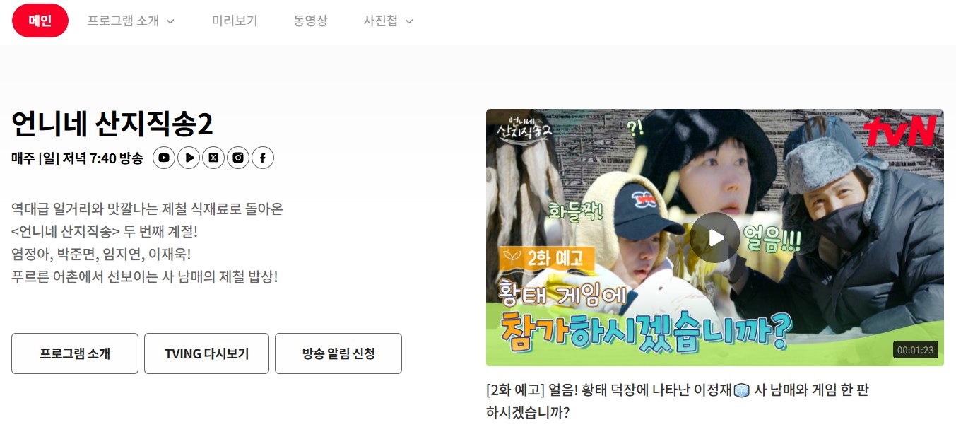 '언니네 산지직송2'는 티빙(TVING)에서 시청할 수 있습니다.