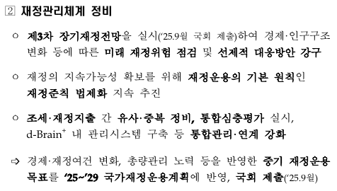 - 향후 재정건전성과 국채 의존도는 과제로 남음