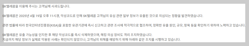 이번 SK 해킹 사고로 인해 소비자 피해가 예상되면서 정부는 SKT에 신규가입 중단과 위약금 면제, 손해배상, 증명책임 완화 등을 권고한 상태입니다. 아직 확정된 건 아니지만, 조만간 공식 입장이 나올 가능성이 크죠.